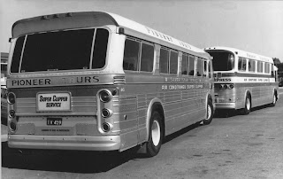 Un clásico de la publicidad fotográfica, mostrando algunos autobuses de Greyhound en lugar atípico en un plácido entorno de California. (texto y foto http://www.motorcoachage.com/)